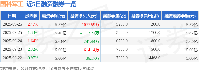 国科军工融资融券信息数据显现,融资方面,当日融资买入4257.19万元,融资归还3179.6万元,融资净买入1077.59万元。融券方面,融券卖出200.0股,融券归还0.0股,融券余量5200.0股,融券余额25.68万元。融资融券余额5.57亿元。